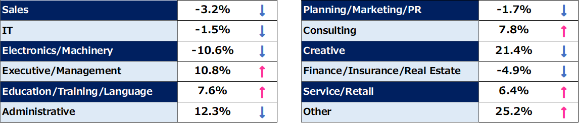 The 29.5% YoY decline in Sales candidates reflects a market stalemate. With expectations for significant "Shunto" (spring wage offensive) pay raises, many bilingual sales professionals are adopting a conservative "wait-and-see" approach, opting to remain in their current roles to secure internal salary increases.