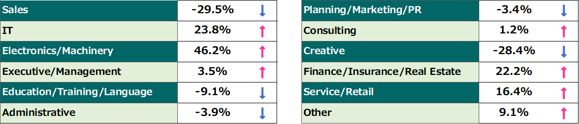 Long-term structural demand remains dominant in Technical sectors, with Electronics & Machinery soaring 46.2% Year-over-Year (YoY) and IT-related roles maintaining a strong 23.8% YoY growth.