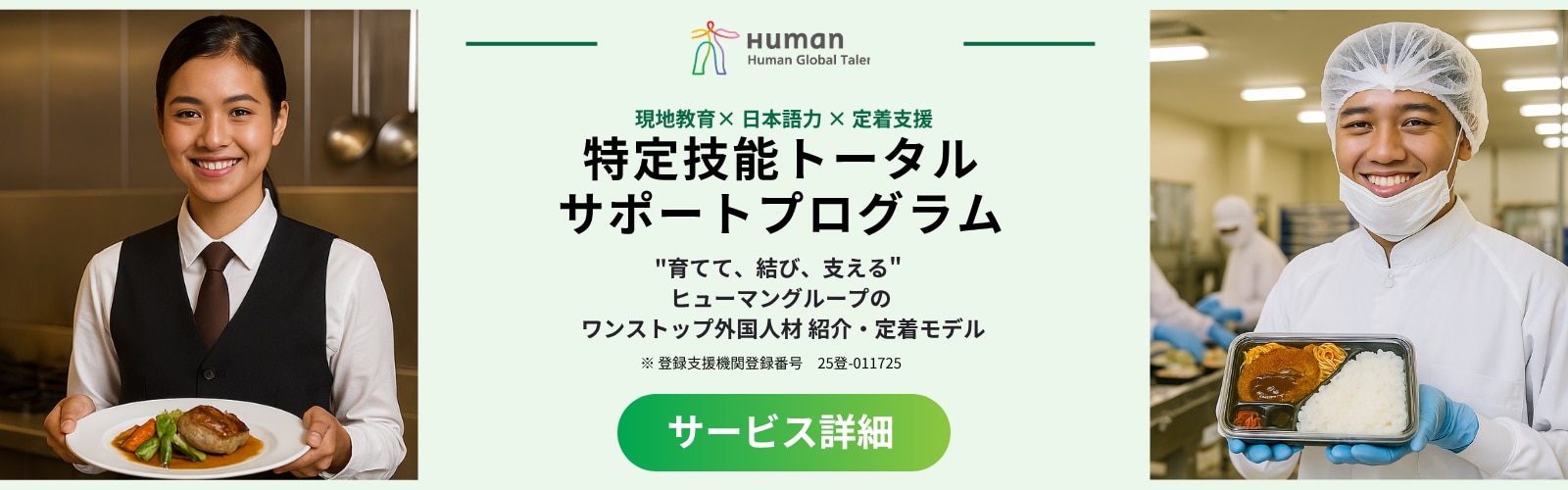 ヒューマングローバルタレント株式会社が提供する「特定技能トータルサポートプログラム」は、初めて外国人材を採用する企業様の「定着の不安」と「コミュニケーションの壁」を解決する、独自のワンストップの体制を構築し、ブローカーの介在が不要で、透明性のあるマッチングを実現します。