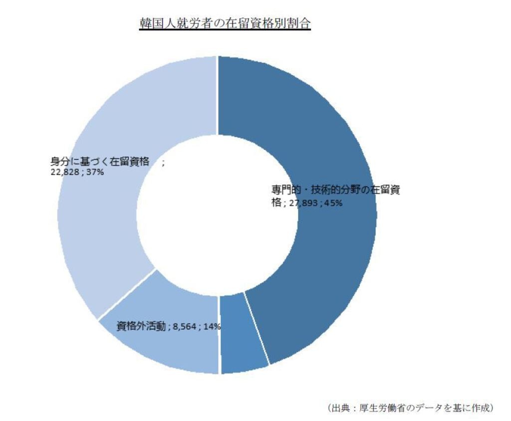 日本における韓国人就労者の特徴は、次頁のグラフで見るように、在留資格に「専門的・技術的分野の在留資格」が多い点である。韓国人就労者全体の45%(2万8000人近く)が、高スキルの人材であるということだ。